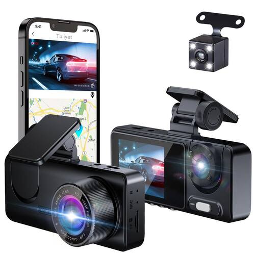 Tuliyet Câmera frontal e traseira, cartão SD 64G, câmera de 3 painéis 1080p para carros, câmera de painel grande angular de 170 graus, tela IPS de 5.1 cm, G-Sensor, WDR, monitor de estacionamento