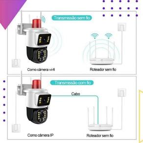 Visão Panorâmica e Tela Dupla: Cobertura de 360 com lentes fixas e rotativas, eliminando pontos cegos. Tela dividida para visualização dupla. Detecção Inteligente: Tecnologia AI de detecção humana reduz alarmes falsos, gravando vídeos de 10 segundos ao detectar movimento. Comunicação Bidirecional Microfone e alto-falante integrados permitem conversa com visitantes, monitoramento remoto via aplicativo, até 5 metros. Resistência a Água e Poeira. Feita de ABS industrial com vedação à prova d'água, opera de -20C a 60C. Visão Noturna Inteligente: Rotação de 355 e vertical de 90, com LEDs ajustáveis para visão noturna eficiente. Conexão Wi-Fi 2.4ghz, suporte a cartão de memória até 128GB. Homologação Anatel: 025931304858