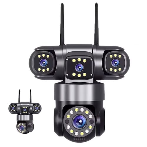 A parte superior esquerda e direita são lentes de posição fixa, 180 graus e vertical: 360 graus. A parte inferior é uma lente PTZ, horizontal 320 graus e vertical 90 graus. Tudo controlado remotamente por meio do aplicativo.
