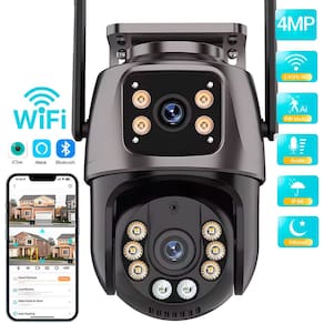 Especificações Técnicas Resolução: 4MP por lenteLentes: Dupla lente de 3.6mmMovimento PTZ: Rotação horizontal de 355°, vertical de 90°Visão Noturna: Infravermelho, colorido e inteligenteConectividade: Wi-Fi 2.4GHzCompatibilidade: iCSee, Amazon Alexa, Google HomeResistência: IP66 (à prova d'água e poeira)Armazenamento: Suporte para cartão TF até 128GB (não incluso)Alimentação: 12V DC (fonte não inclusa)Cor: Preta Conteúdo da Embalagem 1x Câmera de Segurança Dupla Giratória1x Kit de Instalação1x Manual do Usuário Observações Importantes A câmera não acompanha cartão de memória.A fonte de alimentação 12V DC deve ser adquirida separadamente.