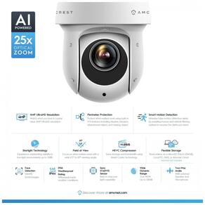CARACTERÍSTICAS A câmera IP PTZ Speed Dome PoE AI possui Detecção de rosto, IVS profundo Tripwire, Intrusão, Objeto abandonado, Objeto ausente , Relatório de metadados de vídeo Pessoas, Veículo não motorizado, e Veículo a motor e Detecção de movimento inteligente. Observe que os recursos de IA incluídos na câmera são incorporados e não exigem um NVR de IA para funcionar. Um injetor ou interruptor de PoE é necessário Não incluído Usa PoE 802.3at . Oferece vídeo 4MP 25fps com um amplo ângulo de visualização de 60 . Mais inteligente, mais e segura Utilize alertas inteligentes que enviam notificações para o seu computador ou smartphone através do aplicativo Amcrest View. Grave eventos nesta câmera PTZ POE assim que eles acontecerem e zene os no seu computador, MicroSD até 256GB , NAS ou Amcrest Cloud. Esta câmera requer PoE energia 802. 3at para operar. Utilize o recurso de zoom de inclinação da panorâmica com zoom motorizado óptico de 25x e zoom digital de 16x, bem como panorâmica contínua de 360 , inclinação de 90 capturando todos os ângulos. Sempre resiliente seja chuva ou brilho, dia ou noite, esta câmera com zoom com inclinação de panorâmica externa tem uma classificação IP66, o que significa que foi construída para suportar o que a mãe natureza lança. Uma vez iniciada a noite, a inovadora tecnologia de luz das estrelas do CMOS Image Sensor e dos LEDs IR ajudou esta câmera a ver até 100 metros à noite, mesmo com luz ultra baixa. A tecnologia H.265 Compression permite que os arquivos sejam compactados sem nenhuma diferença perceptível na qualidade. Encontre Solace na nuvem O Amcrest Cloud foi criado para garantir que você não perca nada, não importa onde esteja. Com uma interface intuitiva, você pode transmitir ao vivo suas imagens, o que permite reproduzi las com base em suas preferências. É necessário um injetor ou interruptor de PoE não incluído Marca: Não Informado