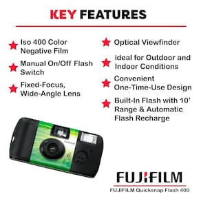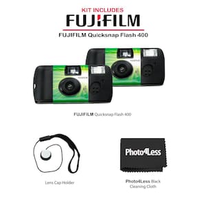 Câmera Fujifilm Quicksnap Flash de uso único com foto divertida para todos, em qualquer lugar, a qualquer hora. A câmera QuickSnap Flash 400 possui um corpo compacto e vem pré-carregada com um filme de velocidade de 400. Esta câmera de uso único produz imagens muito nítidas e possui um flash embutido com um alcance de flash de 3 metros. A câmera QuickSnap Flash 400 é divertida e fácil de usar, e é ótima para tirar fotos em ambientes internos ou externos. O interruptor de flash contínuo facilita tirar várias fotos, permitindo que você se concentre totalmente nas fotos! O pacote inclui: Câmera descartável Fujifilm QuickSnap Flash 400 de 35 mm (pacote com 2) Alça de mão. Pano de limpeza de lentes. - O pacote inclui: Apresentamos o pacote de câmera descartável Fujifilm QuickSnap Flash 400 de 35 mm com alça de mão e pano de limpeza de lentes. Este pacote inclui duas câmeras, proporcionando o dobro da diversão e o dobro das memórias! - Capture com facilidade: capture seus momentos com facilidade, pois cada câmera vem pré-carregada com filme de velocidade ISO 400, oferecendo 27 exposições. Seja em ambientes internos ou externos, esta câmera é perfeita para qualquer configuração. O alcance de flash integrado de 3 metros garante que suas fotos estejam sempre bem iluminadas, resultando em imagens nítidas e vibrantes. - Visão óptica: com um visor óptico, esta câmera permite que você enquadre seus objetos perfeitamente, garantindo que todas as fotos fiquem do jeito que você deseja. Seja ao ar livre explorando a natureza ou capturando momentos especiais com seus entes queridos, esta câmera é ideal para todas as condições. - Rápido e conveniente: projetado com a conveniência em mente, o QuickSnap Flash 400 possui um corpo compacto, o que o torna fácil de transportar e manusear. Sua funcionalidade de uso único permite que você se concentre exclusivamente em capturar aqueles momentos especiais sem o incômodo de recarregar o filme ou configurações complicadas. - Para todas as ocasiões: se você estiver participando de um casamento, saindo de férias ou simplesmente capturando momentos do dia a dia, o pacote de câmera descartável Fujifilm QuickSnap Flash 400 de 35 mm é a sua escolha. Não perca a preservação de suas memórias de uma maneira divertida e sem complicações!