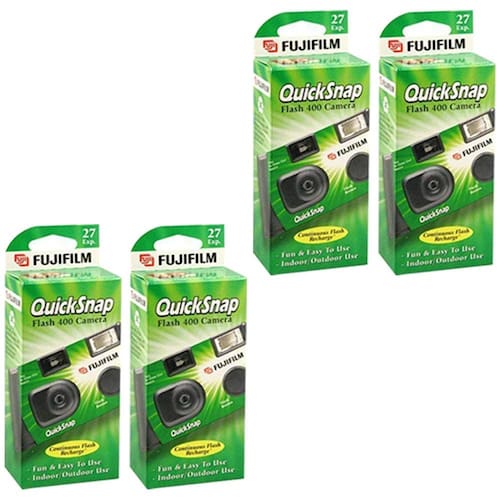 Disponível em embalagem única ou dupla. Carregado com filme Fujicolor de 400 velocidades, reprodução de cores superior, alcance do flash de até 10 pés, flash contínuo recarrega automaticamente para sua próxima foto, lente de foco fixo para fotos nítidas e claras, compacta e fácil de usar