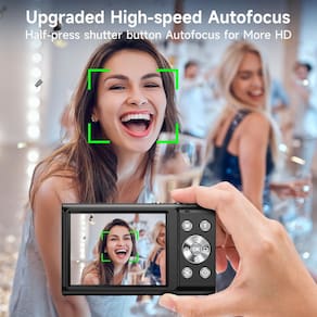 A câmera digital portátil é pequena o suficiente para caber no seu bolso, fácil de carregar em qualquer lugar, em ambientes internos/externos como viajar, acampar. - ?Câmera digital UHD 4K e 48MP?A câmera digital compacta pode ser usada para fazer recursos de vídeo com resolução de vídeo Ultra 4K, pode capturar resolução de imagem de 48 MP, ajudando você a capturar e gravar os momentos memoráveis mais emocionantes com imagens ou vídeos de alta qualidade. - ?Zoom digital e multifuncional de 16X?A câmera digital suporta zoom digital de 16x. Você pode ampliar ou diminuir o zoom do objeto pressionando o botão W/T enquanto grava vídeos e tira imagens estáticas. Esta mini câmera também foi equipada com antivibração, detecção de rosto, detecção de sorriso, disparo contínuo, temporizador automático e captura flexível do objeto fotográfico. - ?Câmera digital de foco automático atualizada?A câmera de vídeo tem função de foco automático atualizada. Observe que você precisa pressionar o botão de disparo primeiro para focar esta câmera digital compacta e, em seguida, pressione o botão novamente para tirar fotos. Com esta função, ele pode focar automaticamente e tirar fotos com grande clareza. - ?Gravação de vídeo e webcam no Youtube?A câmera de vlogging suporta modo de vídeo, microfone embutido, você pode obter vídeos nítidos. Esta pequena câmera também pode ser usada como uma webcam, basta desligar a câmera, conectá-la ao computador, pressionar o obturador e o botão liga/desliga ao mesmo tempo, então ela entrará no modo de webcam para chamadas de vídeo/transmissão ao vivo e assim por diante. - ?Função de pausa e fácil de usar?Esta função de pausa permite que você faça uma pausa ao gravar ou assistir a vídeos de reprodução. E a luz de preenchimento integrada ajuda você a tirar fotos de qualidade no escuro. A câmera digital portátil é pequena o suficiente para caber no seu bolso, fácil de carregar em qualquer lugar, em ambientes internos/externos como viajar, acampar.