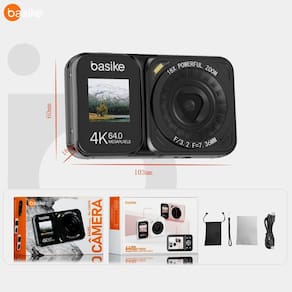 Câmera digital basike 4k 64mp dual screen tela dupla 18x Vídeo 4k uhd e fotos de 64mp - registre em 4k e 64mp com sensor cmos avançado. Alta definição sem ajustes manuais. Tela dupla: frontal e traseira - com visor traseiro de 2,8 e tela frontal de 1,4, facilite selfies e vídeos. Zoom 18x e flash embutido - zoom digital de 18x e flash automático garantem fotos claras mesmo à noite ou de longe. Modos criativos e foco automático - inclui time-lapse, temporizador e efeitos. Foco automático facilita o uso; foco manual dá mais controle. Compacta, leve e ideal para viagens - portátil e resistente, com bateria de 40 minutos e suporte para cartão sd/tf de 8-128 gb não incluso .