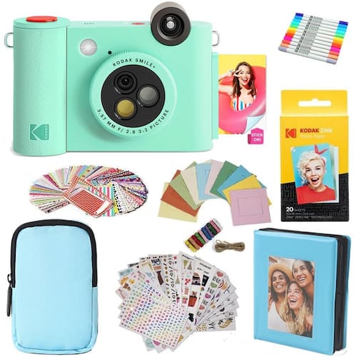 Pacote de presente para câmera digital de impressão instantânea e impressora fotográfica KODAK Smile+ 2 em 1 + estojo + papel fotográfico adesivo Zink 2x3 Sticky Back 20 unidades + álbum + molduras adesivas + molduras suspensas + conjuntos de adesivos + marcadores - Verde