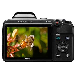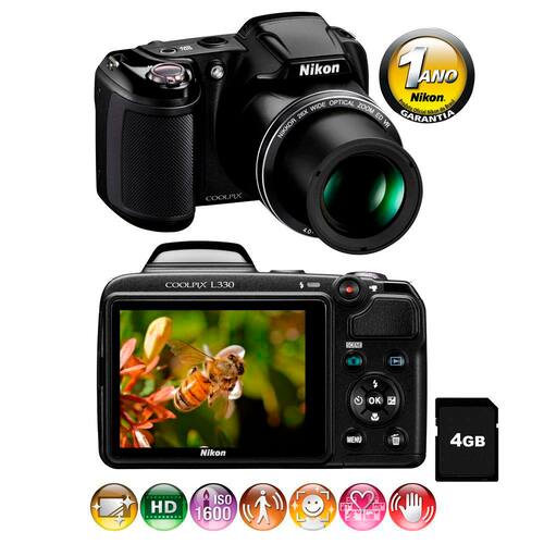 Com a Câmera Digital Nikon Coolpix L330 você registra todos os seus melhores momentos em qualquer lugar e em qualquer alcance. Capture lindas fotos de 20.2 megapixels e vídeos em HD de grandes distâncias com um potente zoom óptico de 26x. A empunhadura ergonômica da câmera e a tecnologia de Redução de Vibração combatem os efeitos de trepidação da câmera, uma grande vantagem ao disparar fotos a distâncias de supertelefoto.