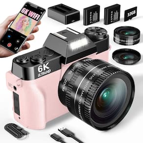 -?Câmera digital 6K com lente grande angular e lente macro?Esta câmera vem com uma lente grande angular e macro removível de 52 mm, permitindo capturar paisagens amplas e detalhes intrincados. Alterne facilmente entre os modos de foto, vídeo, lapso de tempo e outros usando o botão montado na parte superior para ajustes rápidos.