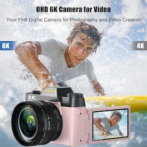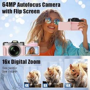 -?Câmera de 64 MP para fotografia e vídeo?Esta câmera digital se destaca em fotografia e vídeo, oferecendo gravação em 6K e fotos de 64 MP. Com zoom de 16X, pausa de vídeo, gravação durante o carregamento, gravação em loop, captura contínua, modo silencioso e temporizador automático, é versátil e fácil de usar. Seu chip atualizado oferece imagens realistas e de altíssima definição, tornando-o um presente perfeito para seus entes queridos.