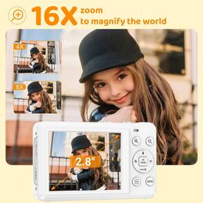 - 🔍 Foco automático e zoom digital de 16X - Desfrute de fotos nítidas com o recurso de foco automático da câmera digital Point and Shoot. Perfeito tanto para vistas distantes quanto para close-ups, o zoom digital de 16X garante que cada foto seja detalhada e nítida. O modo macro permite que você chegue até 10 cm, ideal para capturar os menores detalhes de suas aventuras.