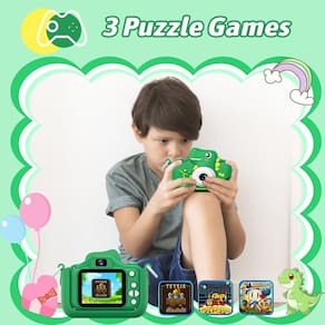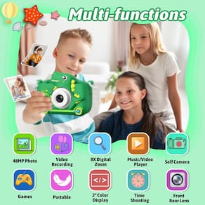 Tire fotos/grave vídeos/selfie/reprodução. Zoom digital 8x/28 quadros/6 filtros. Gravação intermitente/lapso de tempo Jogos/reprodução de música. - Nova câmera de brinquedo infantil atualizada: esta câmera infantil fornece 48 Mega pixels e vídeo 1080p. Melhorou muito a definição de fotos. Inclui captura de fotos, gravação de vídeo, reprodução, zoom digital 8x, 28 tipos de seleções de cena e 6 efeitos especiais e filtros etc. - Múltiplas funções: esta câmera infantil oferece mais funções com base na gravação de fotos autênticos, reprodução, gravação intermitente, temporizador automático. Cada câmera infantil vem com um cartão micro SD de 32 GB (já está instalado na câmera). Baixe as fotos e vídeos para o computador usando o leitor de cartão incluído e compartilhe-os com a família e amigos. Ele também tem jogos de quebra-cabeça integrados e pode reproduzir música. - Design especialmente fofo para crianças: o brinquedo de câmera equipado com uma capa macia de design de dinossauro fofo que é feita de materiais ecológicos, material macio não tóxico, mais confortável para a pele das crianças. Além disso, o pacote inclui um cordão durável para as crianças pendurarem a câmera no pescoço. - Bateria potente recarregável por USB embutida: com a bateria de lítio de grande capacidade integrada, pode tirar fotos continuamente por 2 a 3 horas após o carregamento completo (varia com o uso e outros fatores). Desligamento automático se não houver operação para preservar a vida útil da bateria. - Brinquedo de presente perfeito para meninas e meninos: esta câmera infantil é o melhor presente de festival de aniversário de Natal para meninas e meninos de 3 a 12 anos. Suporta um modo de selfie interessante. As crianças podem tirar fotos ou gravar vídeos com esta linda câmera em qualquer lugar.