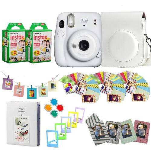 ENFEITE SUA CÂMERA — escolha entre um botão de joia ou um botão brilhante para dar um toque extra à sua câmera. O PACOTE INCLUI câmera, 40 folhas de filme Instax, estojo combinando, 5 molduras magnéticas, conjunto de filtros de 4 peças (vermelho, azul, verde, amarelo), álbum, conjunto de molduras suspensas de 10 peças, conjunto de molduras de mesa de 5 peças e 60 molduras adesivas para adicionar tempero e personalidade às suas fotos