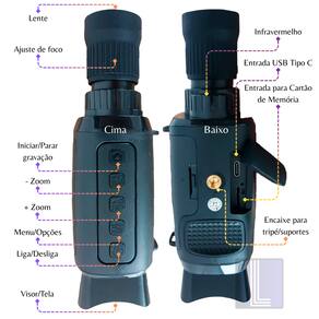 - Modo Câmera (Fotos): Tire fotos de alta resolução com um simples clique. Ajuste o zoom e o infravermelho conforme necessário. - Modo Vídeo: Grave vídeos em 1080P com som. Um indicador visual confirma que a gravação está em andamento. - Modo Álbum: Revise, assista e gerencie suas fotos e vídeos diretamente no aparelho. Controle a reprodução e a velocidade dos vídeos. - Menu de Configurações Completo: Ajuste idioma, data/hora, formatação e muito mais de forma fácil e intuitiva.