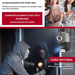 Fabricante: Inova Resolução: 4K Ultra HD (verifique o seu modelo; alguns anúncios usam 1080p) Lente: dupla (cobertura ampliada e melhor percepção de profundidade) Fonte/Alimentação: 110–220 V Instalação: montada na parede Temperatura operacional: 10 a 50 °C Zoom digital: 8x Conectividade: Wi-Fi e Ethernet Controle/Aplicativo: iCSee (Android/iOS e acesso via computador) Potência: 10 W Iluminação: LEDs infravermelhos e LEDs brancos (visão colorida à noite) Tecnologia para baixa luminosidade: visão noturna IR e visão noturna colorida Classificação: IP66 (impermeável e à prova de poeira) Modos dia/noite: comutação automática entre IR e cor noturna Número de LEDs: 9 brancos + 12 infravermelhos Detecção: humana e de movimento, por área/linha e fluxo bidirecional, com ajuste de alertas Marca: Não Informado