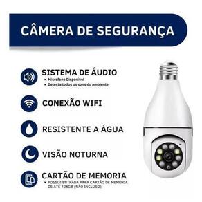 ESPECIFICAÇÕES: Aplicativo: Yoosee Cor do produto: Branco Tamanho: 15,5 x 7,1cm Lente: 3.6mm lente padrão Alta Definição: 1080p Full HD 2MP Conexão Wifi: 2.4ghz não funciona no 5GHz Microfone embutido: Canal de áudio Armazenamento por Cartão SD: Não acompanha Cartão de Memória Áudio bidirecional possibilitando a conversa entre o celular e a câmera Grau de proteção: IP44 Consumo de energia: 3w Compressão de vídeo: Smart H264 Bocal: E27 110-240V Homologação Anatel: 025931304858