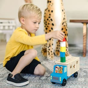 : O brinquedo de caminhão basculante de madeira Melissa & Doug Shape-Sorting é uma experiência de entretenimento e brincadeira de fingir dois em um. Inclui 9 blocos coloridos em diferentes formas e 2 bonecos.