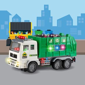 Caminhão Coletor De Lixo Com Som E Luzes 4D - Verde Caminhão de lixo Medidas: 12cm de altura 08cm de largura 25cm de comprimento Possuiluzes 3d Possui som Necessita de 3 pilhas do tipo AA Não inclusas Rotação 360 Recomendação: Recomendado para crianças maiores de 3 anos de idade. Certificado INMETRO: CE-BRI/INNAC - 00152-03A NM 300/2002 Marca: Imports Toys Ean: 7908434904594