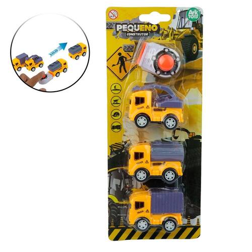 Caminhão com Lançador 4 Peças Construçao Mini caminhões de plástico com lançador para garantir mais velocidade. Contém 4 peças: 1 lançador (2,5x4,5cm) e 3 caminhões (4x5,5cm).\nEspecificações:\nMarca : ARK BRASIL\nTipo de material : Plástico\nCores ou Estampa : Amarelo\nDimensões do Produto : 4 X 5,5 X 2,5 CM\nDimensões da Embalagem : 26 X 10,5 X 3 CM\nPeso Bruto (Gramas) : 0.064 Marca: Não Informado