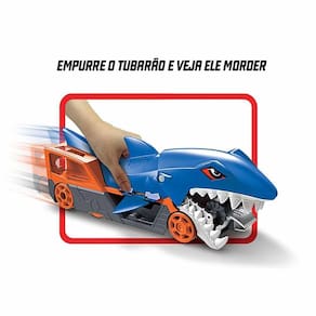 CAMINHÃO DE TRANSPORTE - HOT WHEELS CITY - GUINCHO TUBARÃO MASTIGADOR - MATTEL: o Caminhão Guincho Tubarão Mastigador Hot Wheels é inspirado no icônico mini-veículo Hot Wheels Shark Chomp. Graças a um mecanismo especial de mastigação, que é ativado quando as crianças o empurram, o Caminhão Tubarão é capaz de agarrar um carro diretamente pelas mandíbulas e o armazena em sua barriga. Precisa descarregar? Há uma rampa de saída na parte de trás para facilitar o acesso. O veículo de transporte vem com um carro Hot Wheels na escala 1:64 e pode acoplar até 5 veículos Hot Wheels. O Tubarão Mastigador pode ser conectado a conjuntos e pistas Hot Wheels. INFORMAÇÕES: - Produto: Caminhão Guincho Tubarão Mastgador - Marca: Mattel - Coleção: Hot Wheels - Tipo: Caminhão de Transporte - Tamanho (C x A x L): 35 x 12 x 7 cm - Recomendação: para crianças a partir de 04 anos de idade ESPECIFICAÇÕES: - Referência: GVG36 - Embalagem (C x A x L): 36 x 13 x 8 cm - Embalagem (KG): 0.470 - Composição / Material: Metal e Plástico - Registro: CE-BRI/INNAC 00128-18A NM 300/2002 OCP 0061 - Certificado: Órgãos Autorizados - OCP´S (Organismos de Certificação de Produtos) BENEFÍCIOS DE BRINCAR: - Eleva a autoestima - Estimula o raciocínio - Exercita a imaginação - Desenvolve a criatividade - Promove a socialização e interação - Desenvolvimento neuropsicológico - Estimula habilidades motoras básicas - Incentiva a comunicação e linguagem - Desenvolve aspectos emocionais e afetivos AVISOS: - As imagens são meramente ilustrativas - Os pesos e medidas dos anúncios são aproximados - As cores e estampas dos produtos podem ter variações - As informações são de responsabilidade do fabricante ou fornecedor - Não recomendável para crianças menores de 03 anos por conter partes pequenas que podem ser engolidas ou aspiradas ATENÇÃO: - Comprar Hot Wheels - Guincho Tubarão - Mattel é fácil - Entrega para todo o Brasil - Condições de pagamento facilitadas - Oferta válida por tempo limitado ou enquanto durarem os estoques