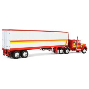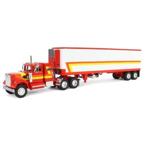 - Esquema de cores vibrantes em vermelho, amarelo e laranja com cabine dormitório vintage de 91 cm e reboque refrigerado vintage de 12 metros.
