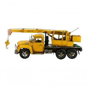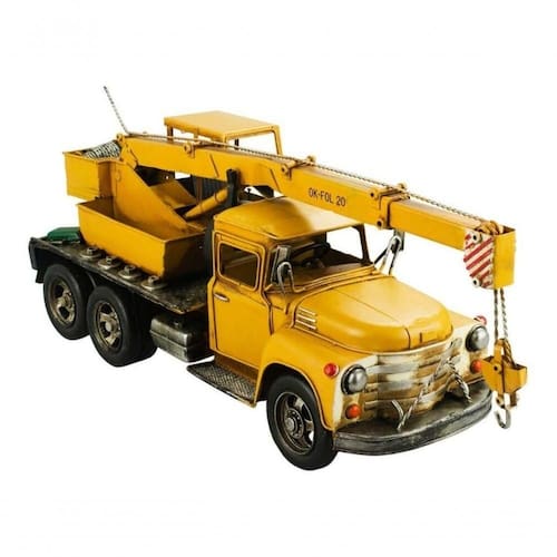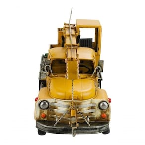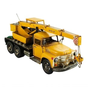 Enfeite decorativo em forma de um caminhão guindaste amarelo com 18 x 13,5 x 46 cm de dimensão, detalhes e cores muito realista. Material: metal; Atenção: este produto tem apenas função decorativa, não é um brinquedo e nem um caminhão de verdade!
