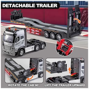 Apresentamos o Caminhão Flatbed Multifuncional de 9 Canais com cabine de metal, corpo em plástico ABS e pneus de borracha real. Este caminhão simulado oferece movimentos de avanço, retrocesso, viradas para esquerda e direita, luzes frontais e no teto, som realista, aumento e diminuição de velocidade. Com botão de demonstração automática para ajudar as crianças a aprender a operar, especialmente os mais novos. O sistema 2.4GHz minimiza interferências para uma operação mais suave, com alcance impressionante de até 20 metros. Possui construção robusta com cabine de metal e portas que podem ser abertas. O caminhão pode ser acoplado a outros veículos e o reboque pode ser destacado para aumentar a velocidade. Certificado ASTM, atendendo aos padrões de segurança de brinquedos dos EUA. Ideal para crianças a partir de 3 anos, com 2 baterias recarregáveis de alta qualidade para até 230 minutos de diversão contínua. Perfeito para brincar dentro e fora de casa, sendo um presente de aniversário ou qualquer ocasião especial.