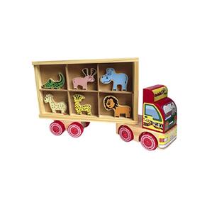 Caminhão em madeira de reflorestamento, com cabine que acondiciona 12 animais de zoológico. Os bichinhos são confeccionados em M.D.F e podem ser decorados com adesivos que acompanham o produto. Incentiva a descrição das cenas, nomeação, o trabalho com dificuldades progressivas, ensino das cores, tamanhos e a criatividade infantil.