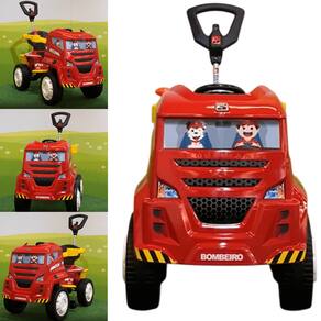 O modelo conta com volante equipado com luz de LED e som, tornando a brincadeira mais interativa. Possui baú sob o assento, caçamba traseira para transportar brinquedos, rodas com anel de proteção e apoio traseiro ergonômico. O sistema de tração por cardan proporciona pedaladas mais leves e confortáveis. Para os responsáveis, a haste vem com suporte para bolsa ou sacola, e o cercado de proteção possui abertura lateral prática.