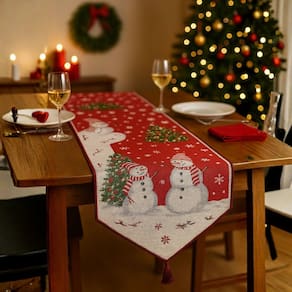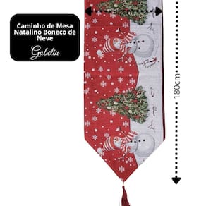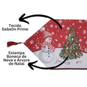 Com 180cm x 33cm, o caminho apresenta estampa natalina premium com boneco de neve, árvore de Natal e detalhes em vermelho e cinza, garantindo charme e elegância à sua decoração. As pontas triangulares e o cordão vermelho decorativo completam o visual clássico e festivo.
