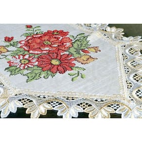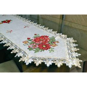 Caminho de mesa em tecido poliéster, na cor palha, com lindos bordados em ponto cruz de flores em tons de vermelho, bege e branco e folhas verdes e acabamento em renda guipir em toda lateral na cor bege e palha.