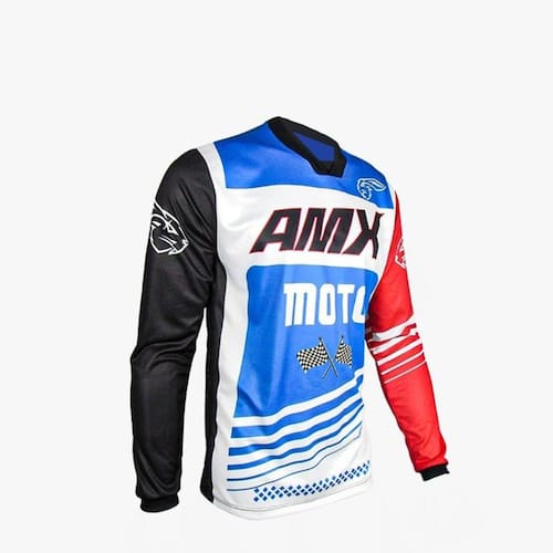 Camisa Amx Prime Moto Azul Branco Vermelho leve, ventilado e resistente para uso motocross, trilha, bike, pedalada, velocross e downhill.