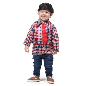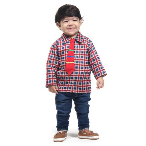 A Camisa é ricamente decorado com uma gravata vermelha com detalhe em fitas em cores vibrantes, trazendo um toque de alegria e autenticidade ao visual. Enquanto o xadrez clássico vermelho, o torna um item indispensável em qualquer guarda-roupa caipira. proporcionando um look completo e encantador para o seu pequeno caipirinha.
