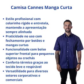 Camisa Cannes Manga Curta Elegância, conforto e praticidade para o dia a dia A camisa Cannes manga curta é ideal para compor uniformes com um toque de sofisticação. Seu corte social proporciona um caimento impecável, enquanto o tecido leve garante conforto durante todo o expediente.