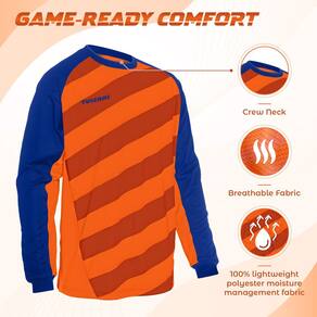 - Costuras reforçadas: garante durabilidade enquanto o acolchoamento de espuma EVA absorvente de choque nos cotovelos oferece proteção. Camisa de goleiro acolchoada para confiança no campo