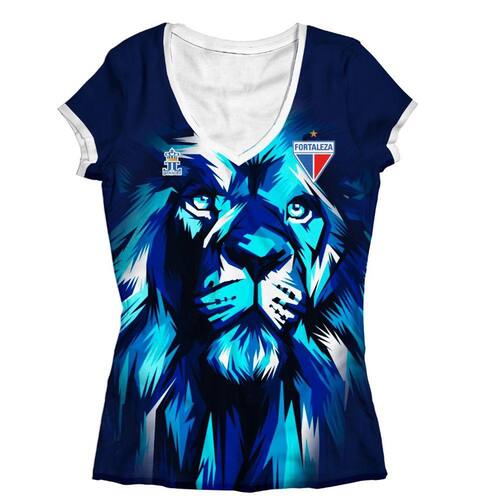 A camisa do Fortaleza feminina é de mangas curtas, com gola V.