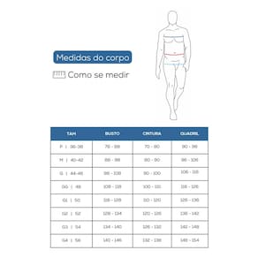 Medidas do Modelo: Altura: 174cm, Cintura: 85cm, Quadril: 102cm, Tórax: 94cm