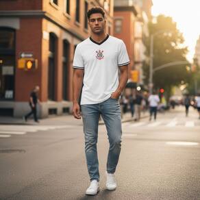 Com manga curta e gola V, esta camiseta masculina é perfeita para os dias mais quentes, proporcionando liberdade de movimento e um ajuste confortável. Seja para um jogo no estádio ou um encontro com amigos, a Camiseta Corinthians é a escolha certa para qualquer torcedor que deseja se destacar.