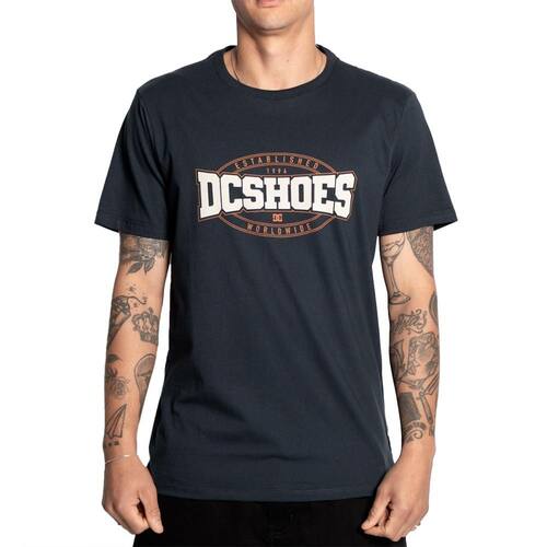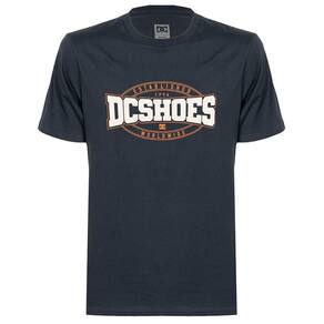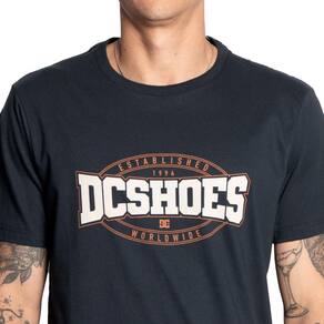 Camiseta Dc Shoes feita em modelagem regular, meia malha 30.1, estampa frontal e etiquetas personalizadas.