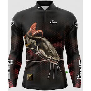 CAMISETA DE PESCA KING BRASIL COM PROTEÇÃO UV 50+ (KFF647N) \nCamisa com proteção Solar, Tamanhos P ao XG \nProtege a Pele dos Efeitos nocivos do Sol \nUv protection e o fio inteligente que protege sua pele da ação dos raios UV-A e UV-B com fator de proteção solar de 30+ a 50+. \nPara os mais exigentes, as camisas da King Brasil com proteção UV protegem a pele durante a exposição ao sol com maior conforto e funcionalidade. \nDevido a modificações no DNA do fio, essa funcionalidade tem ação prolongada durante toda vida útil do produto. \nE a alta tecnologia e segurança que você sente na pele. \n- 100% poliéster\n- Proteção Solar UV\n- Impressão é feita em papel Epson de alta qualidade durável toda vida útil do produto.\n- Gola padre\n- Corte raglã\n- Tecido Tecno Dry Fit \n- Tecnologia de alta Absorção\n- Tecido leve\n- Conforto Térmico\n