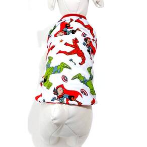 Pijama confeccionada em malha PV poliéster com viscose na cor branca; Estampa temática do Personagem Os Vingadores; Acabamento em cotton vermelho; Tamanho : EG; Cor: Branca; Medidas aproximadas: 47 cm de comprimento, 65 cm de circunferência torax, 41 cm pescoço; Deixe seu Pet super estiloso com seu personagem favorito. Marca: Não Informado