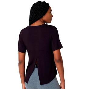 Sua modelagem regular conta com manga curta, barra arredondada e um detalhe inovador: uma abertura vertical nas costas com travete, permitindo a amarração do tecido para ainda mais ventilação e versatilidade. Produzida com matéria-prima de fonte renovável, é uma escolha sustentável para quem valoriza performance e responsabilidade ambiental.