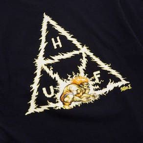 A Camiseta HUF X Street Fighter Blanka celebra o icônico jogo de 16 bits do final dos anos 80 e 90, confecionada em algodão de malha pesada oferece ótima qualidade, a estampa frente e costas traz o triãngulo triplo eletrizado referênciado ao um dos ataques do personagem.Detalhes: * Composição: 100% Algodão Pré Encolhida * Stret Fighter Estampado Na Manga Esquerda* Manga Curta * Gola Canelada* Estampa Frontal e Costas * ImportadoCuidados e Limpeza: * Lave a mão ou na máquina* Na secagem,seque ele sempre na sombra,evitar utilizar secadora de roupas* Não Passar Ferro Sobre a Estampa* Não usar alvejantes, e nenhum outro produto químico