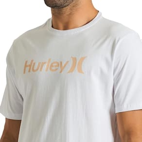 Camiseta Hurley feita em meia malha 30.1, gola rebatida, estampa localizada base d'agua e etiqueta clips ONE&ONLY na barra.