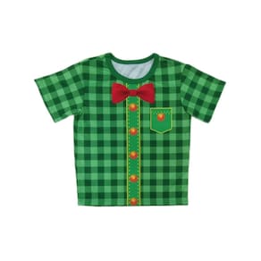 A camiseta é toda estampada, inclusive a gravata borboleta.