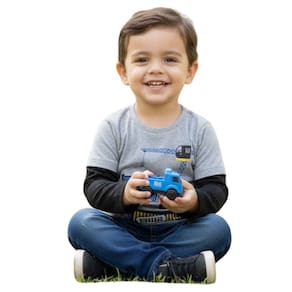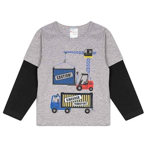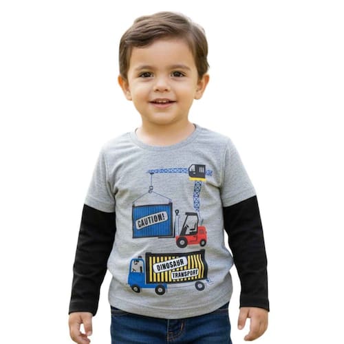 Camiseta infantil confeccionada em tecido macio e confortável, ideal para o dia a dia. Possui mangas longas, gola redonda e estampa divertida com tema de construção e caminhão, trazendo um visual moderno e cheio de estilo. Modelo confortável que garante liberdade de movimentos, perfeito para escola, passeios e momentos de lazer.