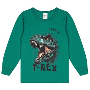 Camiseta infantil confeccionada em tecido macio e confortável, ideal para o dia a dia. Possui mangas longas, gola redonda e estampa divertida de dinossauro T-Rex, perfeita para os pequenos que adoram aventura. A modelagem garante liberdade de movimentos, sendo ideal para escola, passeios e momentos de lazer.