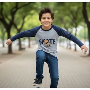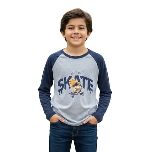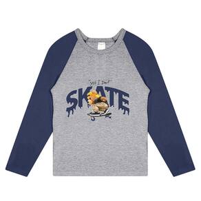 Camiseta infantil manga longa com estampa frontal temática skate. Modelo confortável, ideal para o dia a dia, escola e passeios. Possui gola redonda e mangas em cor contrastante, trazendo um visual moderno e estiloso.