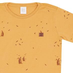 Básica e indispensável no guarda-roupa dos pequenos fashionistas. Camiseta em meia malha na cor ocre com estampa de barquinhos, gola redonda com reforço, mangas curtas e etiqueta termocolante frontal. Combine com bermudas da coleção e crie looks incríveis para seu garotinho.