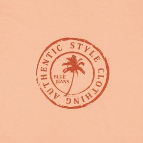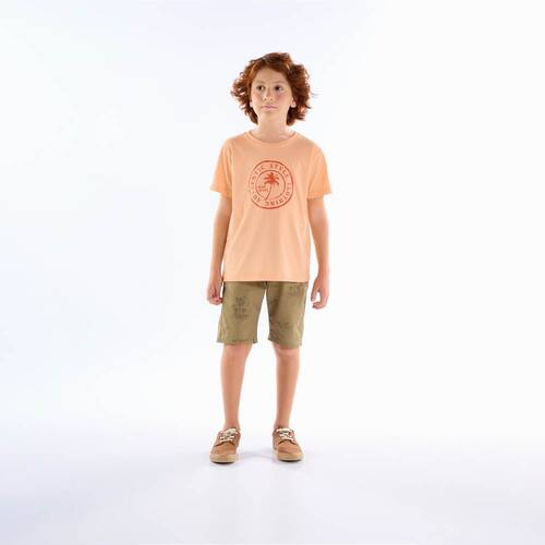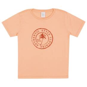 Camiseta infantil confeccionada em meia malha na cor pêssego, possuí gola redonda e estampa frontal de coqueiro com escrita traduzida "roupa de estilo autêntico", básica e versátil para seu menino curtiro o dia de sol com os amigos.
