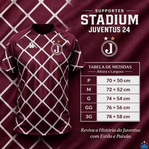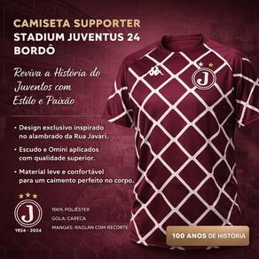 Reviva a história do Juventus com uma camiseta que une tradição e modernidade. Com design exclusivo na cor bordo, o modelo traz grafismo inspirado no estádio da Rua Javari, destacando a identidade do clube. Confeccionada em tecido leve e confortável, oferece ótimo caimento e liberdade de movimento para o dia a dia ou momentos de torcida.
